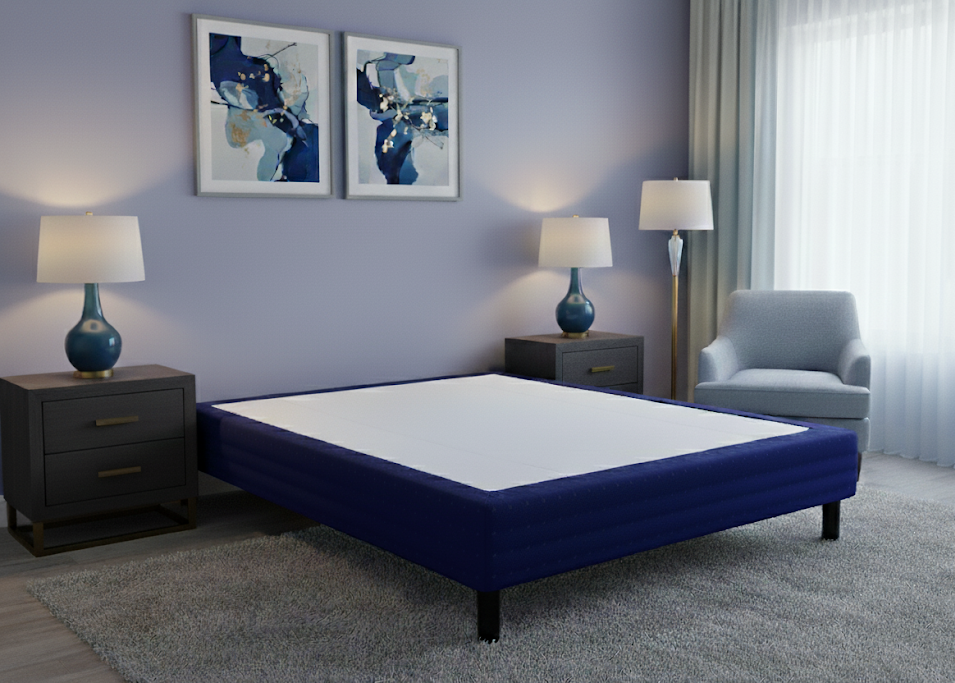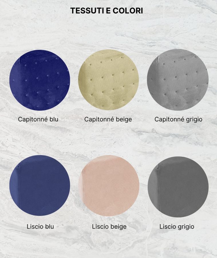 Disponibile in tessuto liscio blu, beige e grigio o tessuto capitonné blu, beige e grigio.