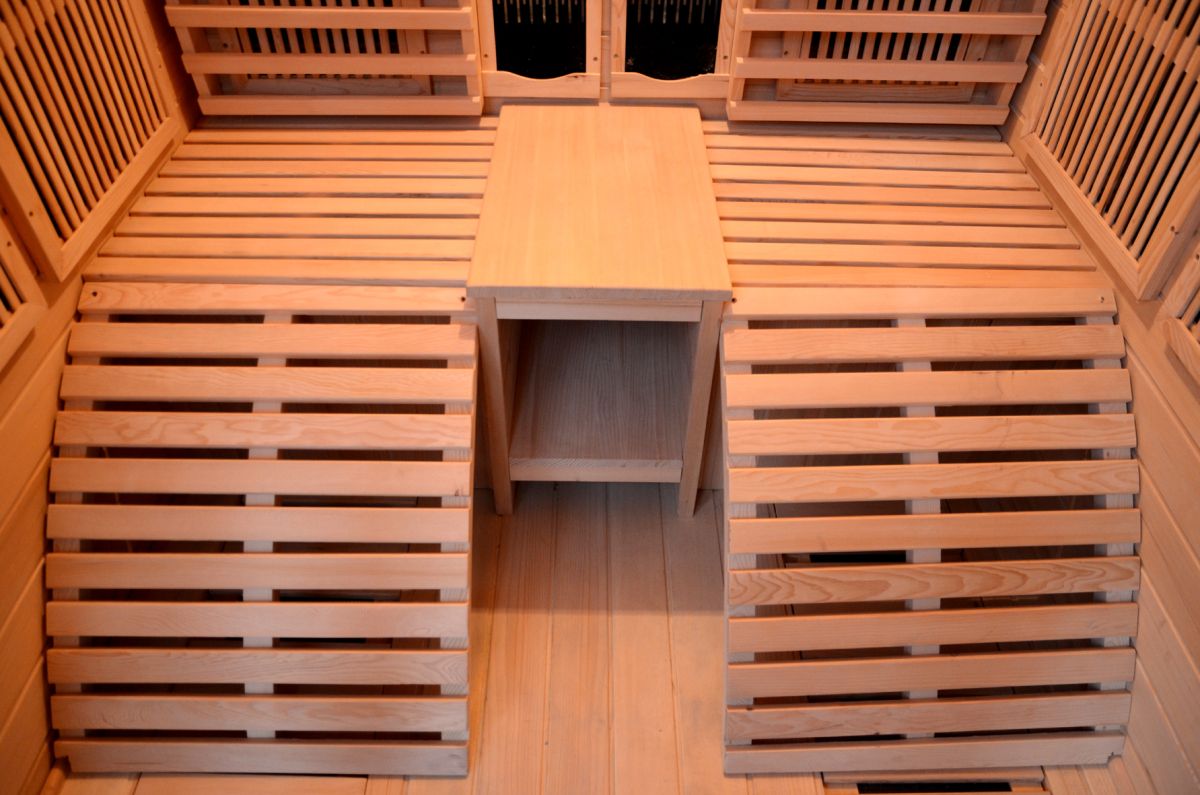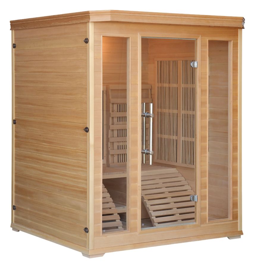 Dimensioni: 150 x 150 x 190 cm - 2 sdraio in legno - 8 piastre irradianti in carbonio - 2 irradiatori infrarossi in ceramica - Radio, usb, mp3 - Ionizzatore per profumoterapia - Cromoterapia 7 colori - Temperatura: da 18 a 65 °C - Potenza: 2740 W - Legno: Hemlock
